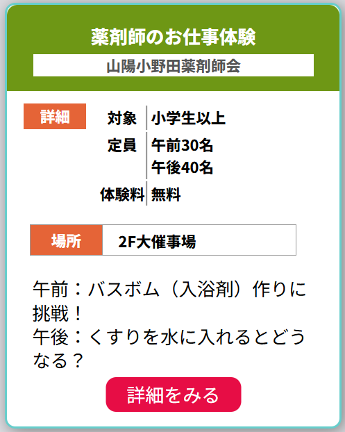 2階大催事場の「イベント・産業科学体験エリア」で、山陽小野田薬剤師会でバスボムが体験できるブースを出展。体験待ちの長い行列ができる盛況ぶりでした!